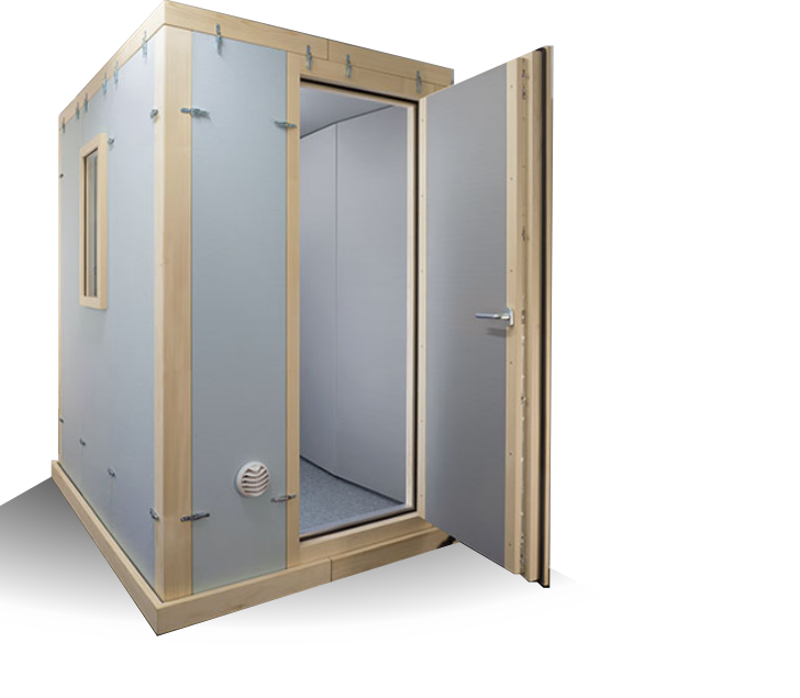 Jedes STUDIOBOX Akustikelement ist zweischalig aufgebaut. Äußere und innere Schale sind jeweils durch einen entkoppelten Rahmen miteinander verbunden. Nut und Feder sowie Doppeldichtungen in den Stößen sorgen für ein höchstes Maß an Dichtigkeit der montierten Schalldämmkabine. Mittels Kniehebelverschlüssen werden die Elemente zusammengefügt.
